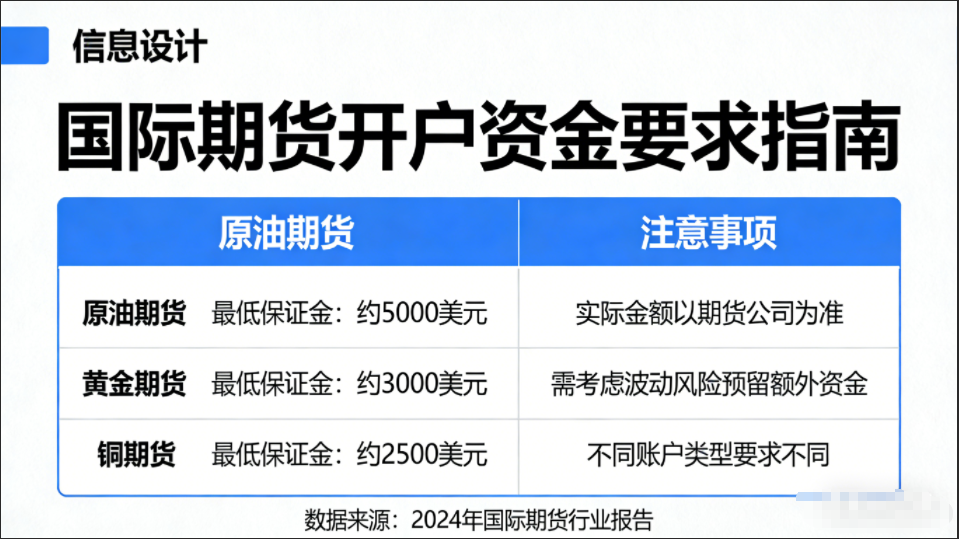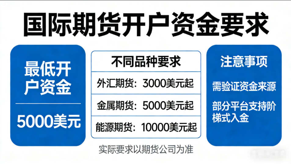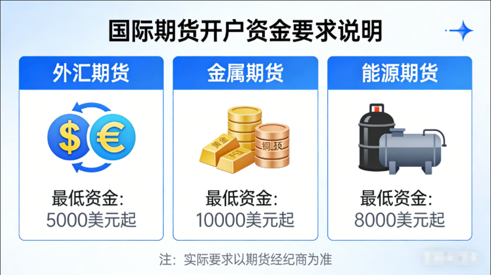 与境内期货部分品种有明确验资要求不同,国际期货开户本身多为免费,核心资金门槛体现在“最低入金金额”,即激活账户所需的最低资金,不同维度差异显著。