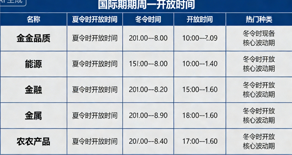 周一开盘时间:夏令时(3-11月)7:00;冬令时(11月-次年3月)8:00(电子盘开启时间)。